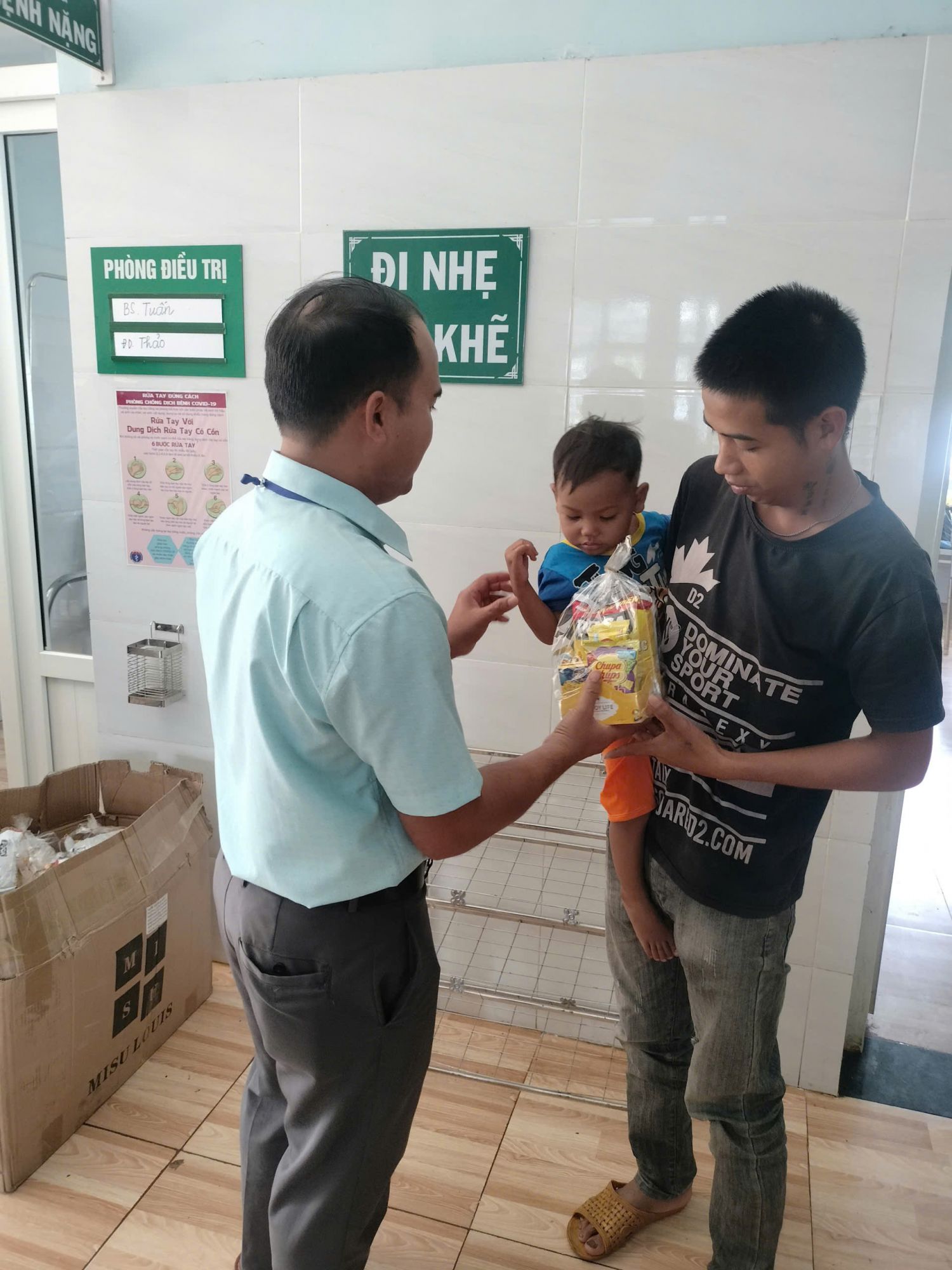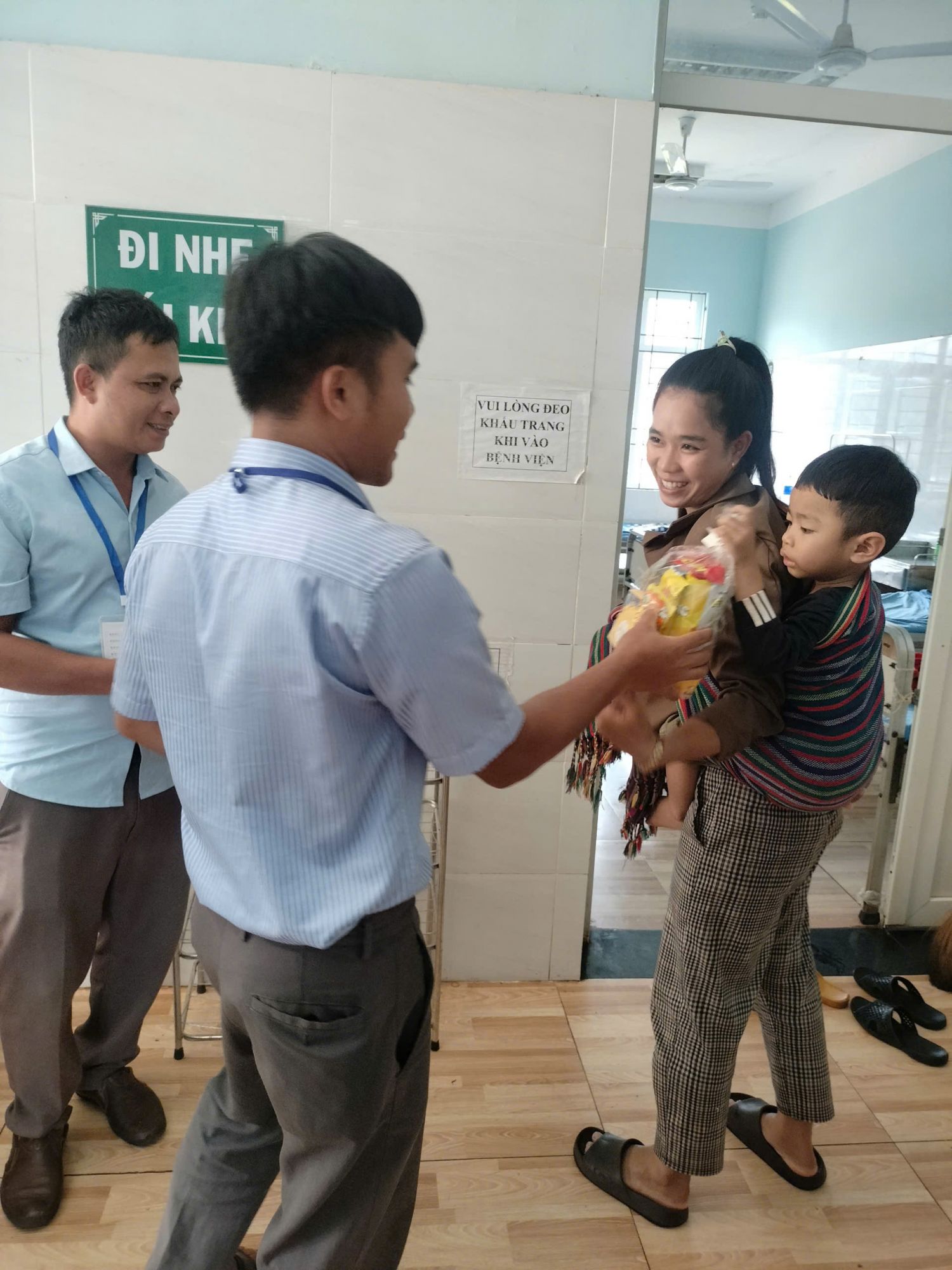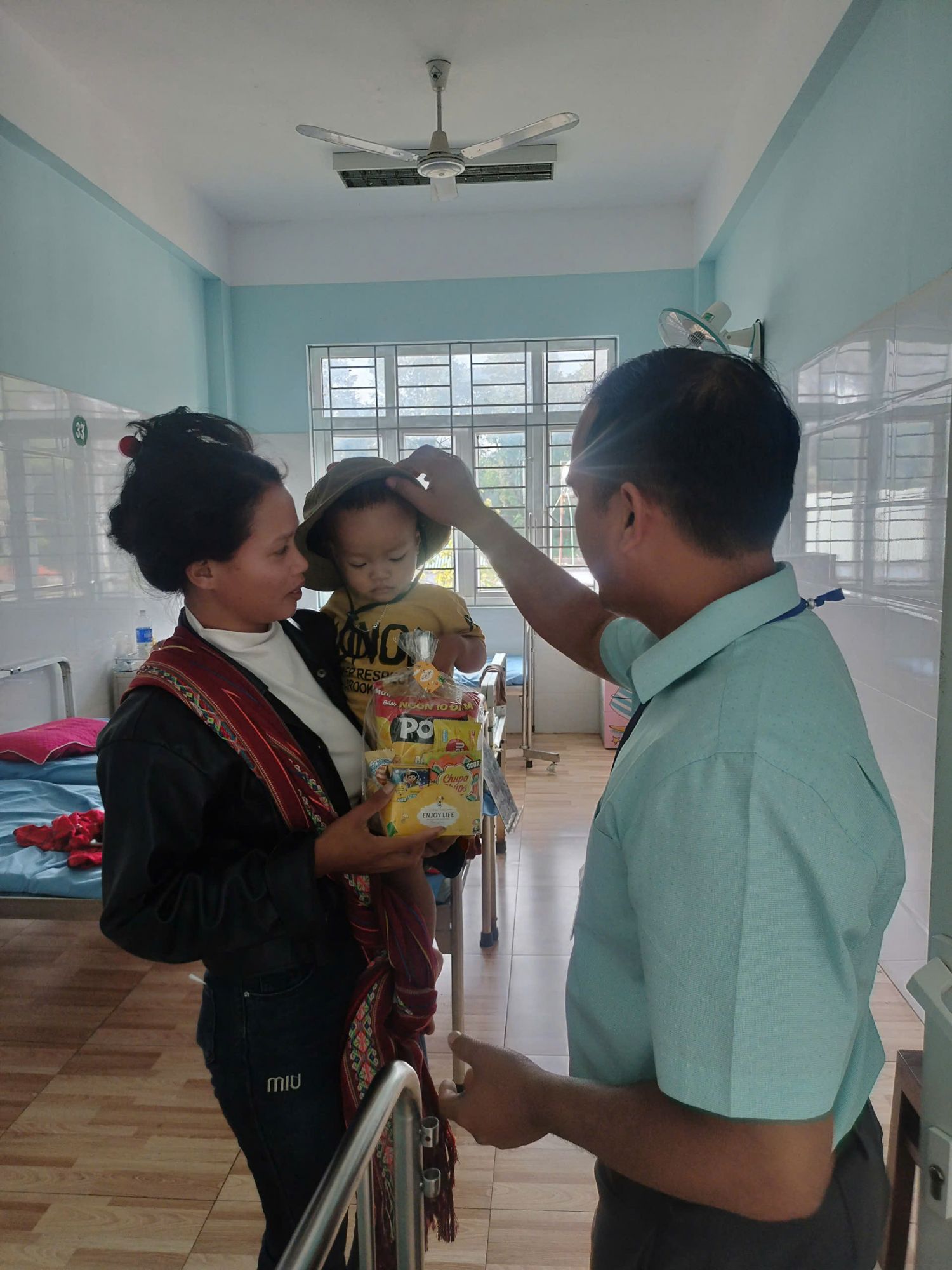 BS CKI Võ Nguyên Giác - Phó Giám đốc TTYT tặng quà động viên bệnh nhi đang điều trị tại TTYT