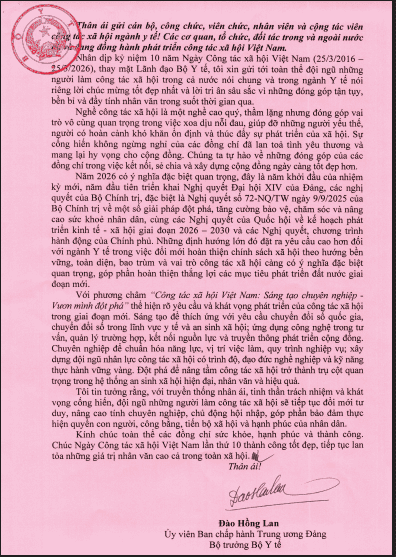 Thư của Bộ trưởng Bộ Y tế nhân dịp kỷ niệm 10 năm Ngày Công tác xã hội Việt Nam (25/3/2016 – 25/3/2026).